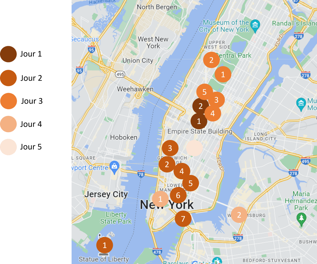 Nous avons défini notre planning jour par jour en regroupant les centres d’intérêts par quartier. Voici notre programme sur la map de New York.
