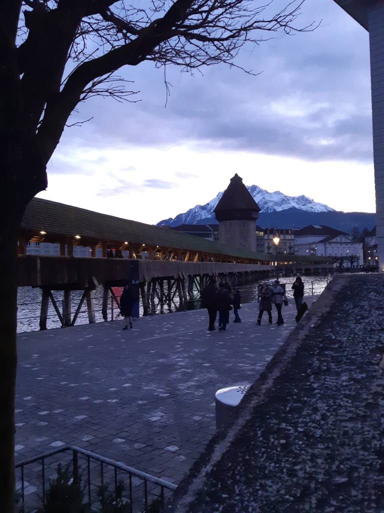 Prochain stop : Lucerne, une petite ville de 80 000 habitants. La ville est connue pour son pont médiéval couvert en bois, le Kapellbrücke. Nous nous sommes garés dans le centre-ville pour boire un café et nous balader sur ce fameux pont. Comme nous sommes partis juste après noël, il y avait encore les décorations et les guirlandes qui éclairaient la ville, en plus on apercevait facilement les montagnes enneigées derrière le pont !