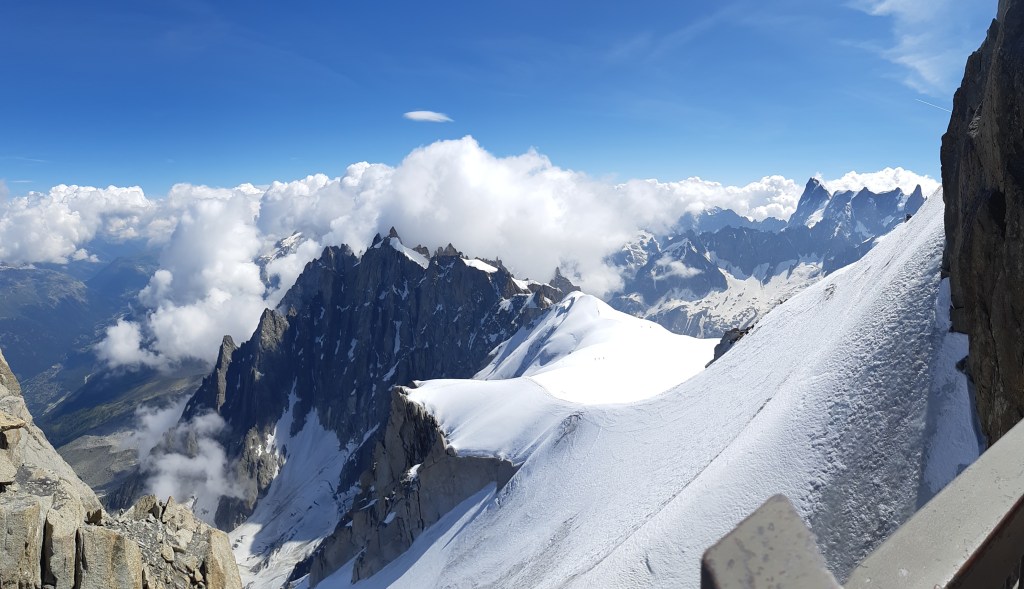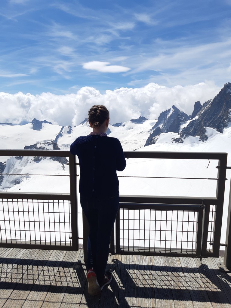 La montée en téléphérique dure une vingtaine de minutes et est assez impressionnante, car la cabine se balance beaucoup sur le câble ! Une chose est sûre, arrivé en haut, on ne regrette pas d’être monté ! La vue est incroyable. Bien sûr, même en été, il y a de la neige à l’Aiguille du midi parce qu’on est à 3 842m ! En haut, il y a une terrasse d’observation et également un café qui propose quelques snacks. Nous avons eu de la chance, car il y avait un grand soleil !
