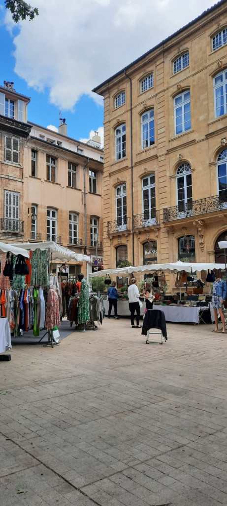 Nous sommes arrivés à Aix-en-Provence en fin de matinée, l’occasion parfaite pour découvrir les différents marchés de la ville. Tous les samedis, il y a plusieurs marchés au centre-ville. Il y a le marché textile et de l’artisanat qui s’étend sur le cours Mirabeau et, si vous continuez votre balade jusqu’au quartier Comtales, vous pourrez également découvrir un marché alimentaire, mais également un marché aux fleurs.
