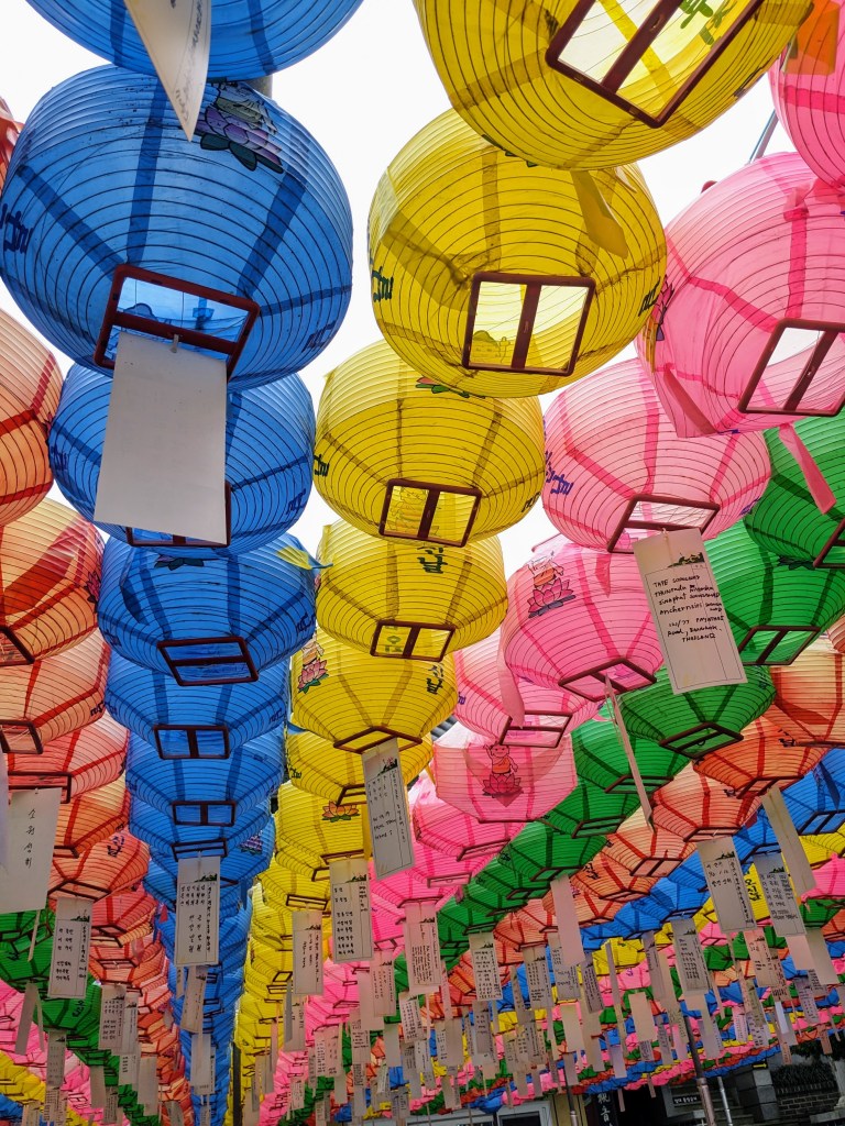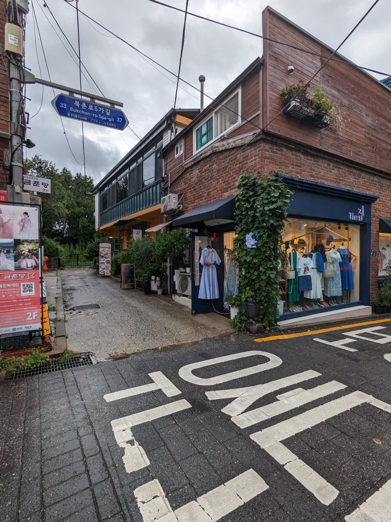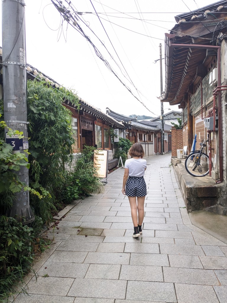 Nous nous sommes ensuite dirigés au Bukchon Hanok Village. Ce quartier est connu pour ses ruelles étroites, ses maisons traditionnelles coréennes appelées hanok. Depuis le quartier, on a une vue imprenable sur les gratte-ciel modernes de la ville, et on se rend bien compte du contraste fascinant entre histoire et modernité. C’est un lieu touristique et de nombreuses maisons hanok ont été transformées en galeries d’art, boutiques artisanales, cafés et restaurants.