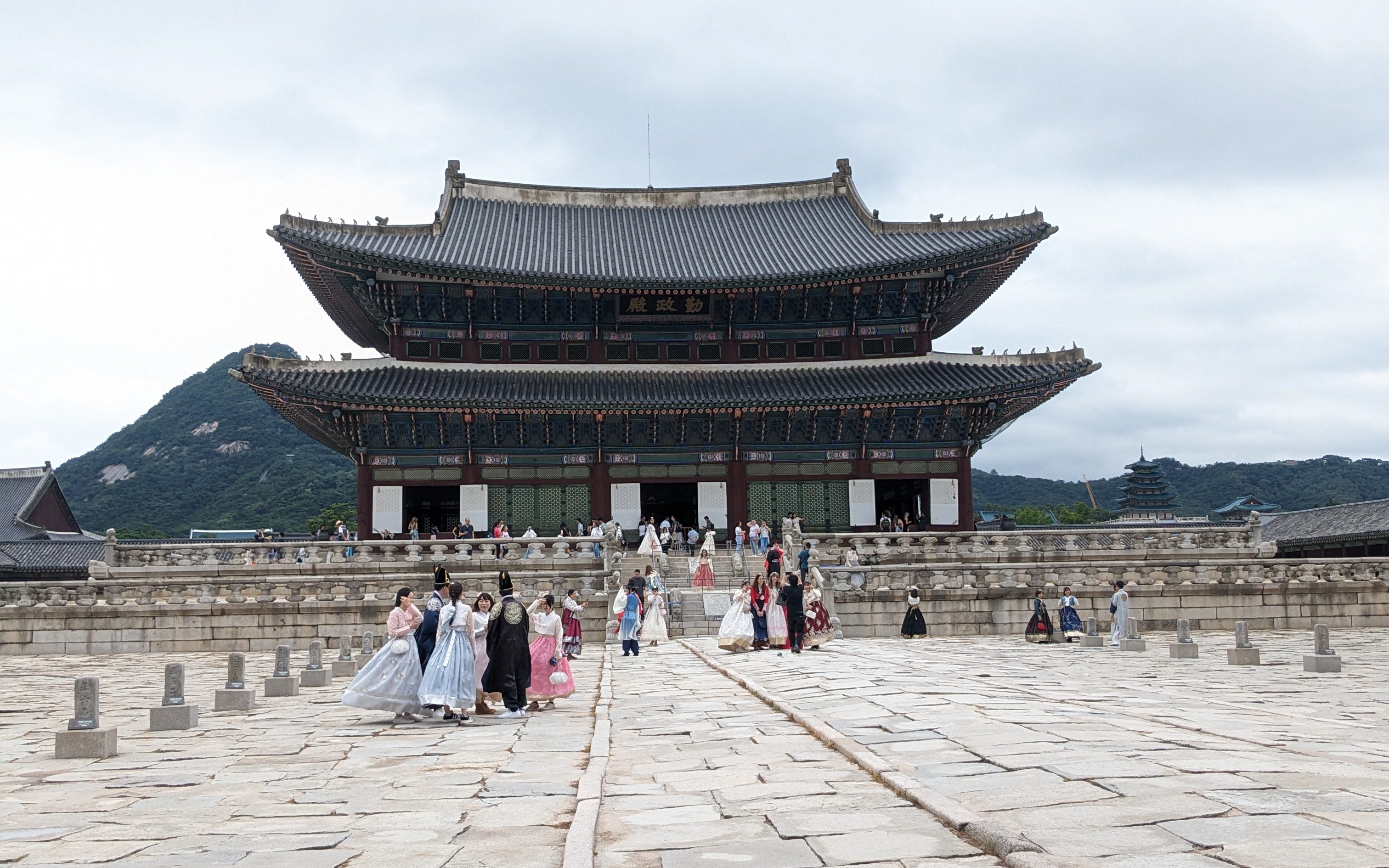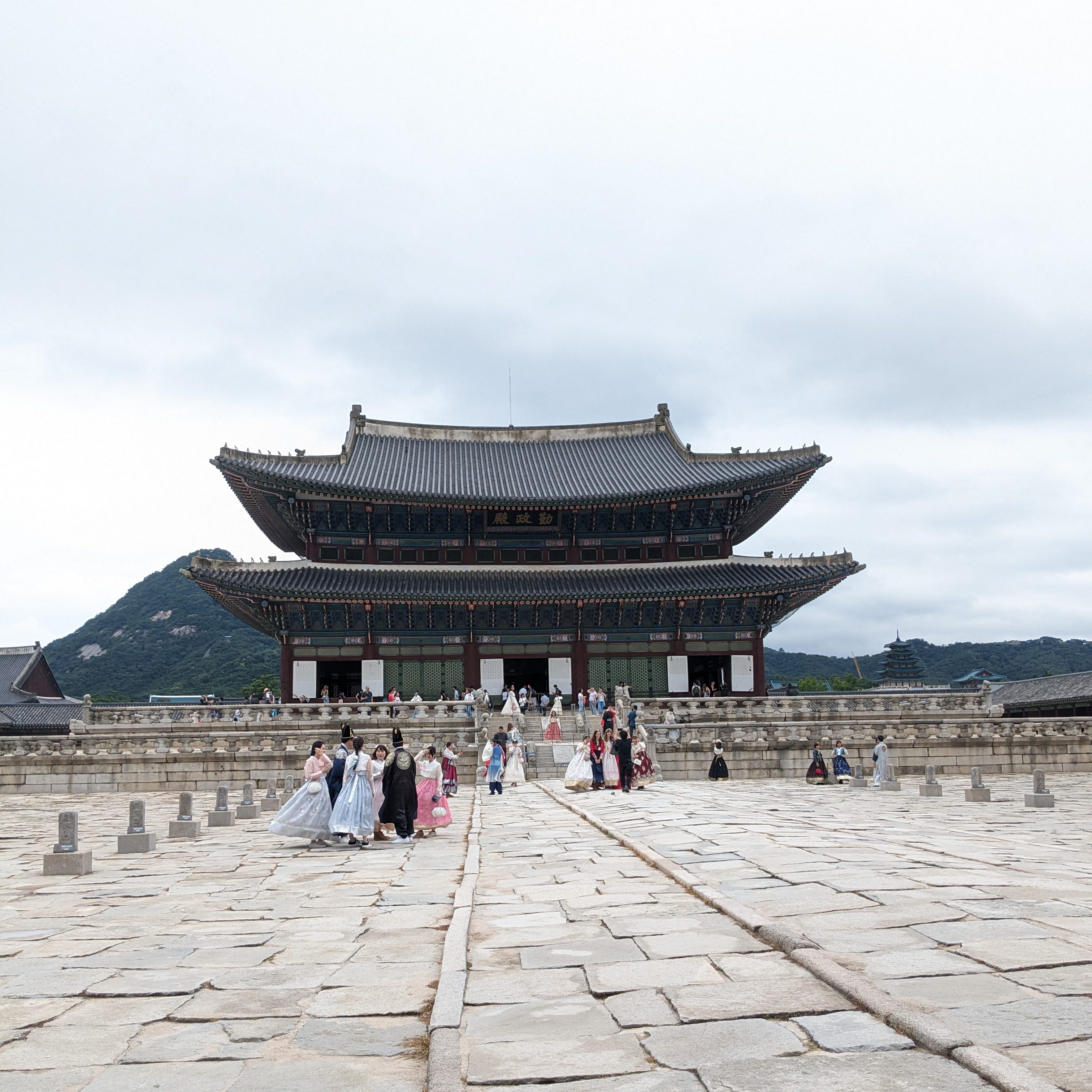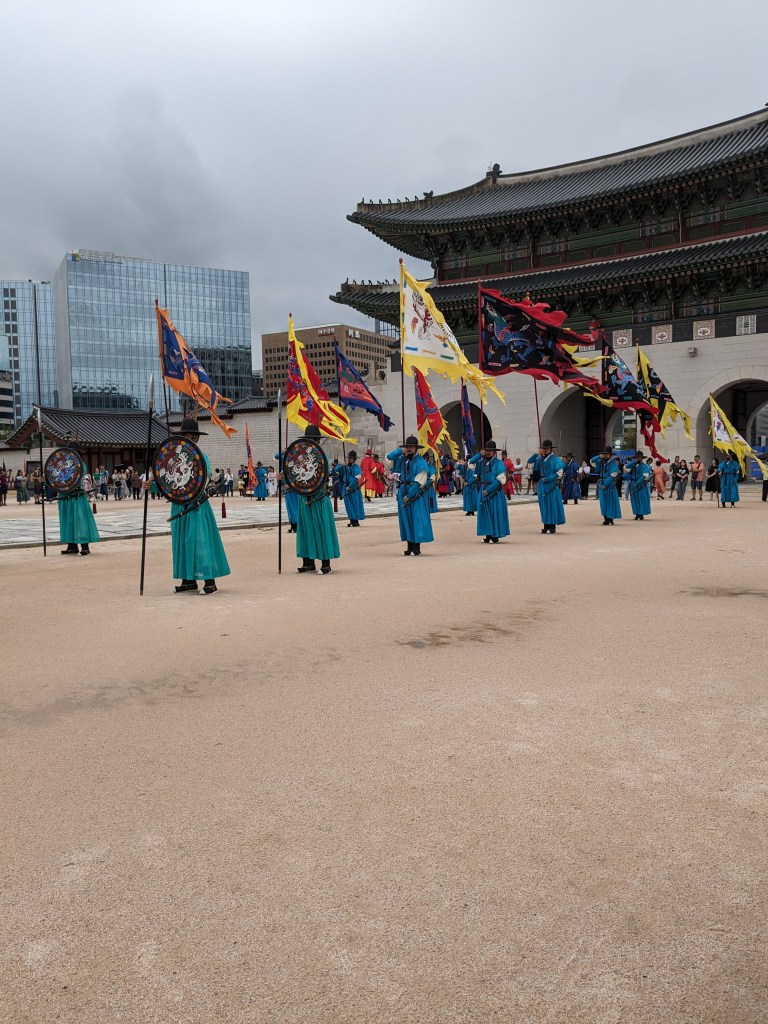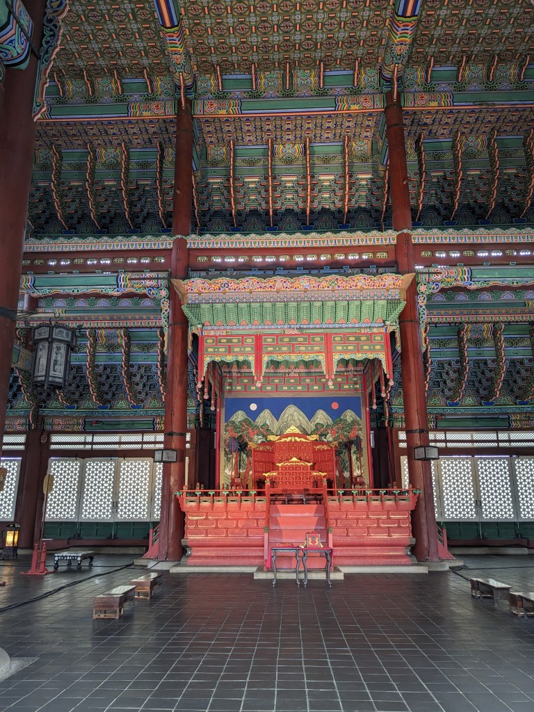 Nous nous sommes rendus au Palais de Gyeongbokgung qui est à quelques minutes à pieds de l’hôel, c’est aussi l’occasion de tester en chemin un des très nombreux coffeeshops du quartier. Gyeongbokgung est l’un des principaux palais royaux de Séoul et a servi de résidence principale aux rois de la dynastie Joseon. On a assisté à la cérémonie de changement de la garde à l’entrée principale du palais. L’entrée coûte 3000 krw (environ 2,10€) mais est gratuite si on vient visiter le palais vêtu d’un hanbok, la tenue traditionnelle coréenne qu’on peut louer à proximité du palais. Tous les jours des visites en anglais sont disponibles gratuitement. C’était assez utile pour comprendre l’agencement et l’histoire du lieu.