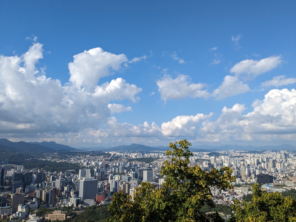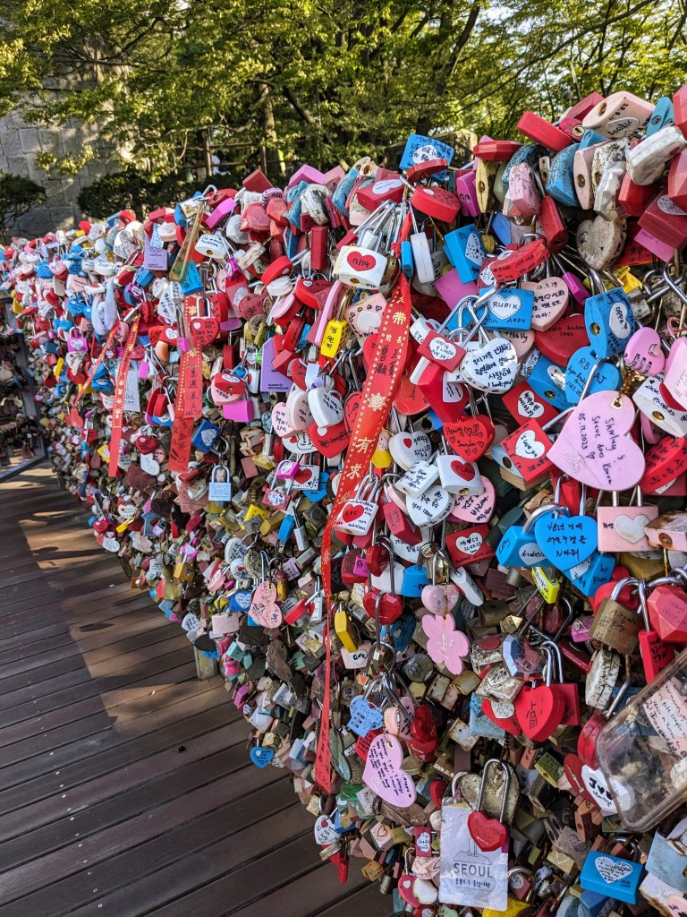 Pour terminer la journée, nous avons pris le téléphérique qui mène à la N Tower, la tour de communication située sur le mont Namsan. Le téléphérique coûte 14 000 krw (environ 9,80€) et, une fois arrivé en haut, au pieds de la tour, on a une vue panoramique assez incoryable sur Séoul ! Il est possible de visiter la tour mais nous ne l’avons pas fait car l’entrée était assez chère (21 000 krw – environ 14,70€) et nous n’étions pas certains que cela vaille le coup car la terasse panoramique à la sortie du périphérique offre sensiblement la même vue.