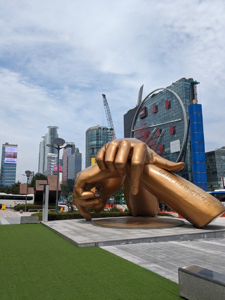 Nous avons poursuivi la journée dans le quartier de Gangnam en passant par la K-star road. Cette rue est connue pour ses trottoirs décorés avec des plaques des empreintes des mains des célébrités, souvent des stars de K-pop, des acteurs, des mannequins. Je pense que ce n’est pas un must-do car la rue n’est pas très joli et il y a en réalité peu d’intérêt à cette attraction touristique.
