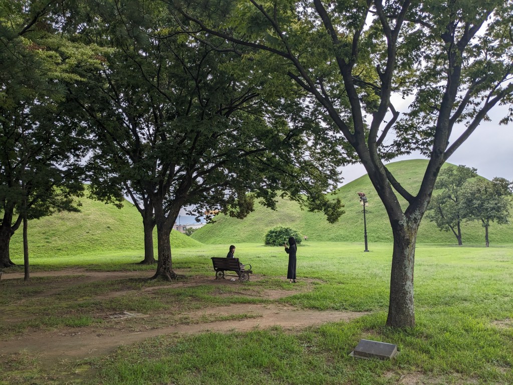 Gyeongju abrite de nombreux tumulis, des monticules funéraires en forme de dômes, qui sont les tombes des anciens rois et nobles du royaume de Silla. Nous avons donc commencé notre visite de Gyeongju par le Tumulis Park. On peut s’y promener gratuitement mais il y a très peu d’explications en anglais.