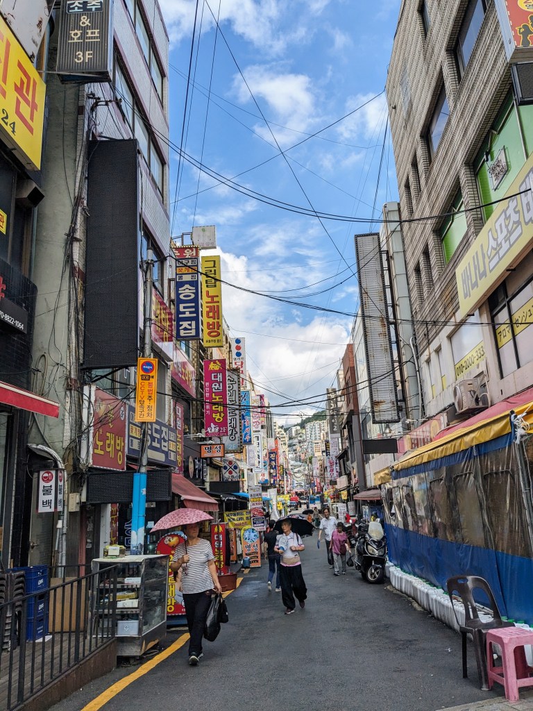 Nous avons commencé la découverte de Busan par la visite de Gamcheon Culture Village. C’est un lieu emblématique de la ville connu pour ses maisons colorées encastrées sur les colines. Il y a de nombreuses galeries d’art, boutiques artisanales et cafés dans ce lieu touristique. Au sommet du village, il y a des points de vue panoramiques qui offrent une vue imprenable sur le quartier en contrebas, ainsi que sur la ville et la mer au loin. Tout est fait pour prendre des photos et il faut parfois même faire la queue ! Mais cela reste tout de même un lieu très atypique et agréable à visiter.