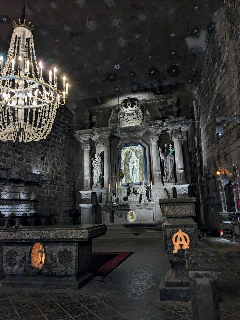 Durant la visite, c’est la Chapelle de Saint-Kinga qui m’a le plus impressionée. Cette chapelle est entièrement sculptée dans le sel, y compris les lustres, les autels et les sculptures. On peut même s’y marier !