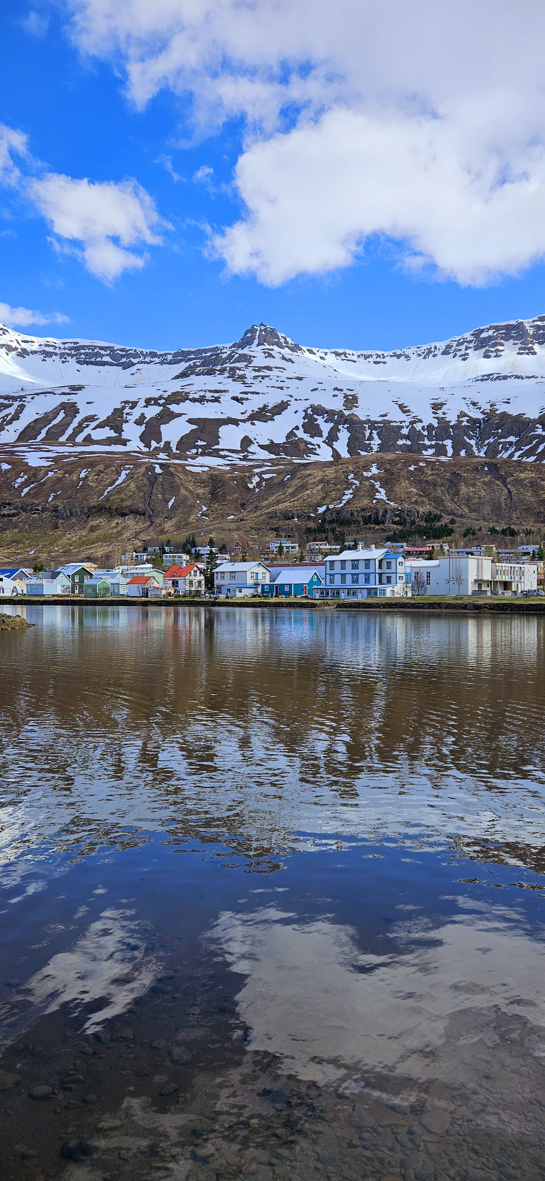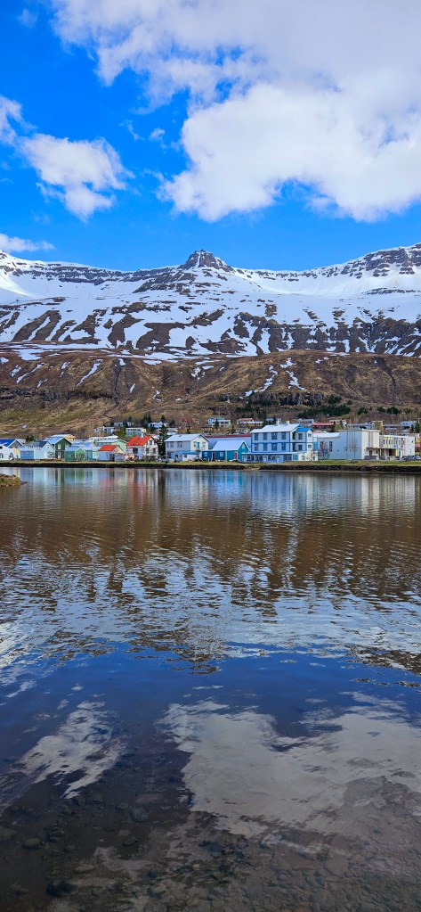 Nous avons poursuivi la route jusqu’à Seyðisfjörður, un village au pied des montagnes, au bord du fjord. C’est l’endroit parfait pour admirer le paysage et faire de jolies photos vers la petite église. Il y a des magasins, cafés et restaurants car c’est un endroit assez touristique. Il y a même un petit port avec des départs en bateau pour les îles Féroé.