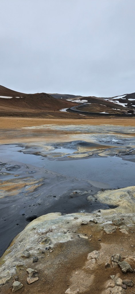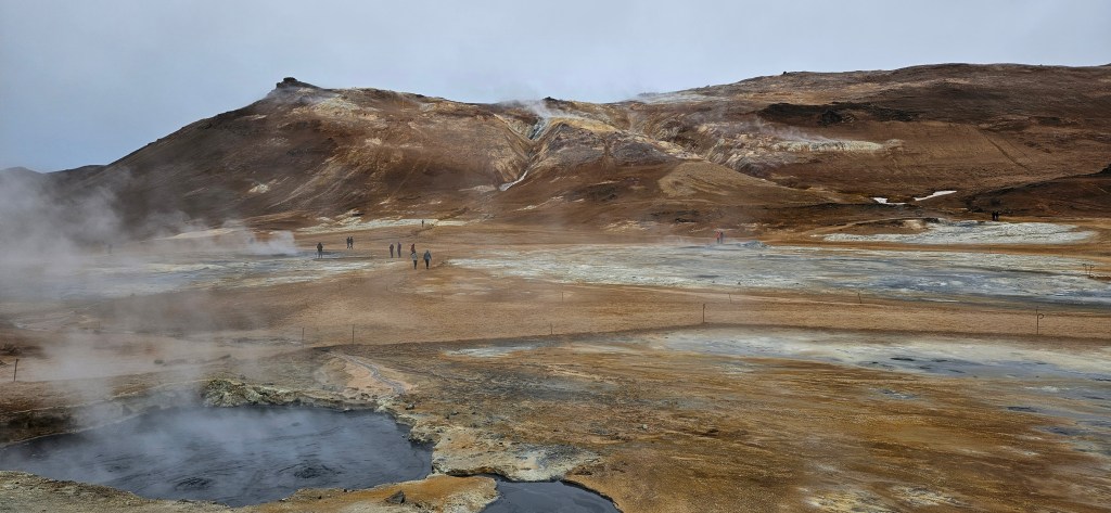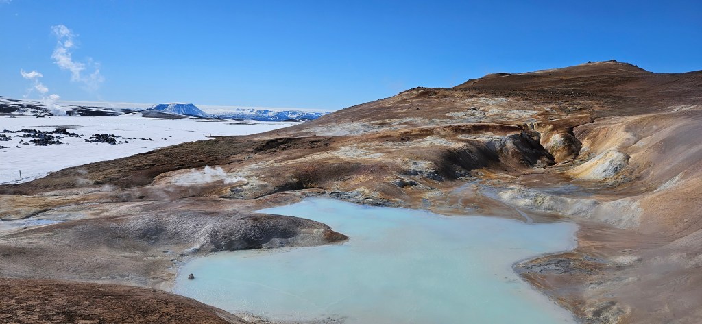 Nous avons commencé par nous balader sur le site Leirhnjúkur. C’est en fait une zone de cratères, de fumerolles et de coulées de lave, où l’on peut voir de la vapeur s’échapper du sol. Il y a des sentiers balisés mais, tout le chemin était recouvert de neige lors de notre visite. Depuis le parking (gratuit), la randonnée dure environ 1h30 et les paysages sont magnifiques !