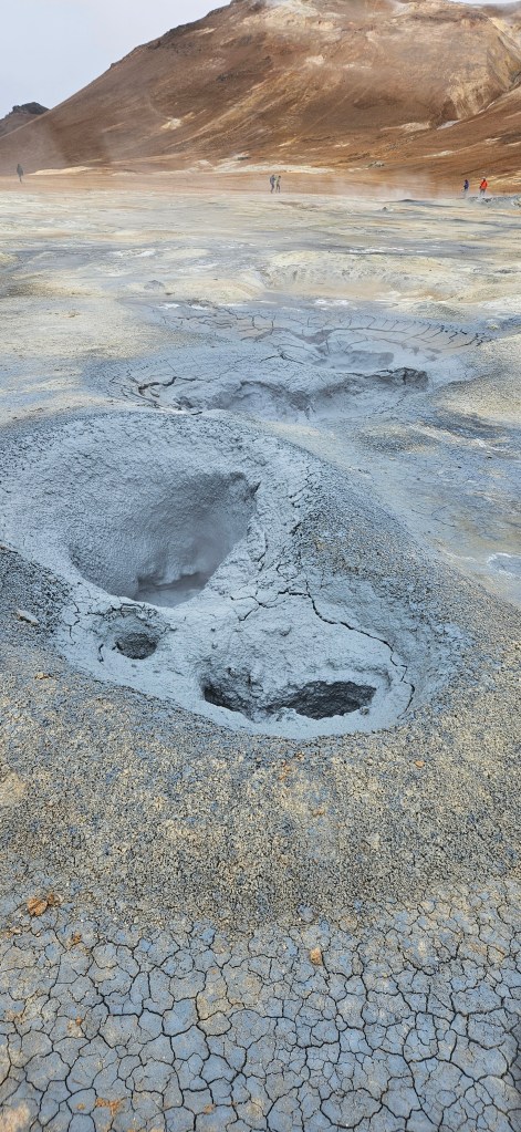 Il y a aussi des « marmites de boue » bouillonnante. Ces bassins de boue grise ou marron sont chauffés par l’activité géothermique et bouillonnent en permanence.