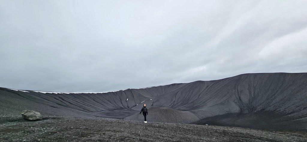 Ensuite, on a repris la voiture pour aller sur le parking du cratère Viti qui se situe à peine 5min de Leirhnjúkur. Viti est un cratère rempli d’un lac turquoise formé après une éruption mais, comme le lac était recouvert de neige c’était assez décevant. On est simplement resté devant le cratère mais on peut en faire le tour à pied.