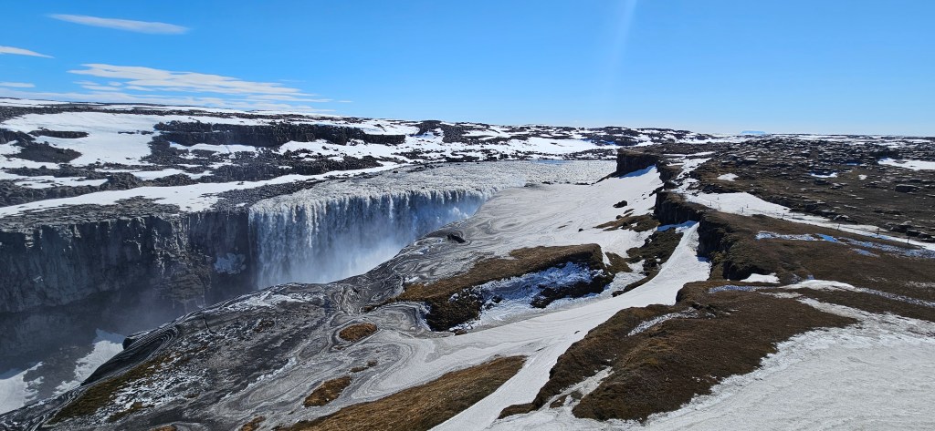 On a fait un petit détour sur le chemin pour voire une autre cascade, Dettifoss située dans le parc national de Vatnajökull. Le chemin était encore tout enneigé du coup, le sentier balisé était invisible. La cascade est vraiement jolie et impressionnante. Elle a servi de lieu de tournage pour le film « Prometheus » de Ridley Scott.