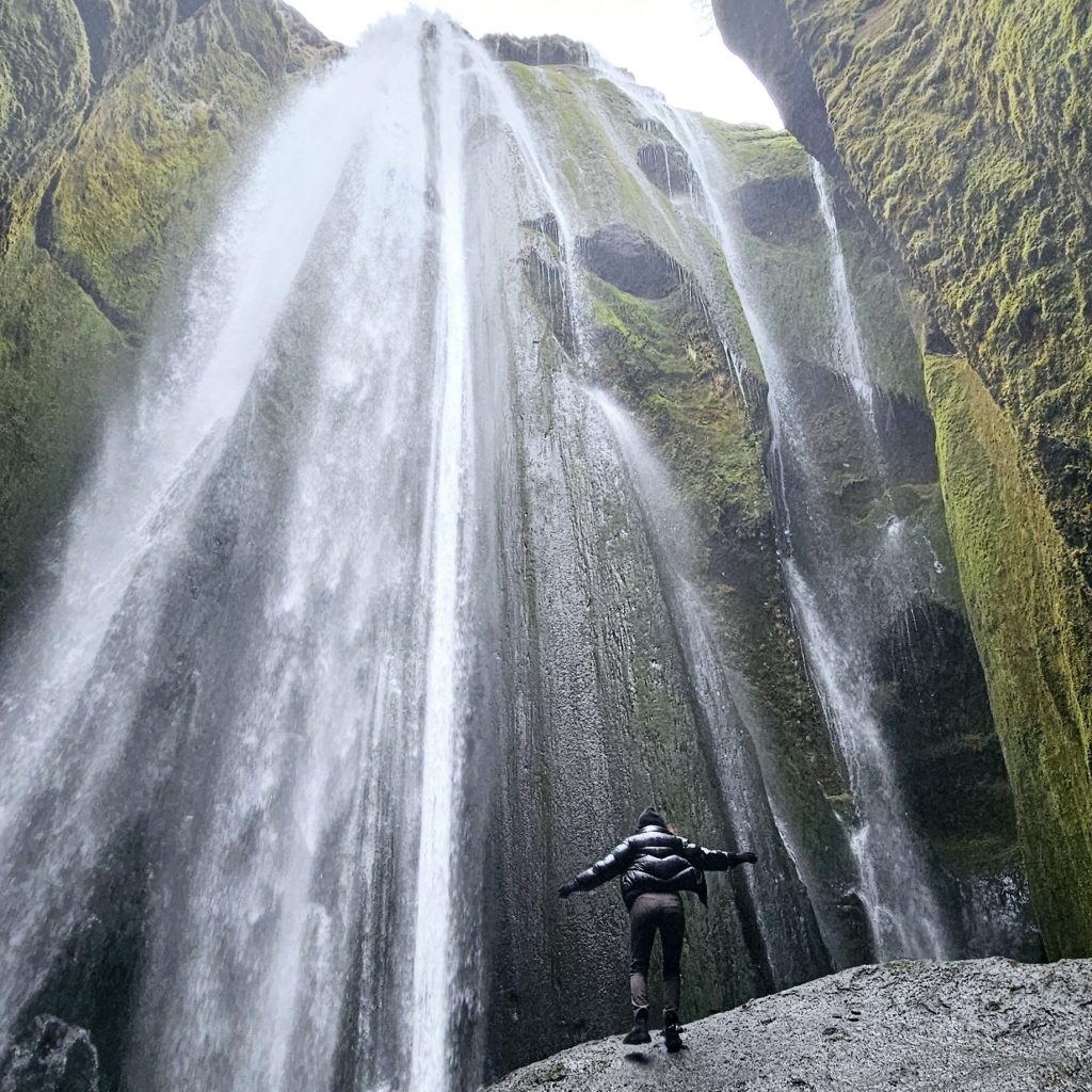 Nous avons commencé la journée par la cascade Seljalandsfoss. Le parking est payant et coûte 6€, finalement c’est plus « l’attraction » qu’on paye que le parking car ici aussi tout est aménagé : il y a un chemin balisé et des toilettes.