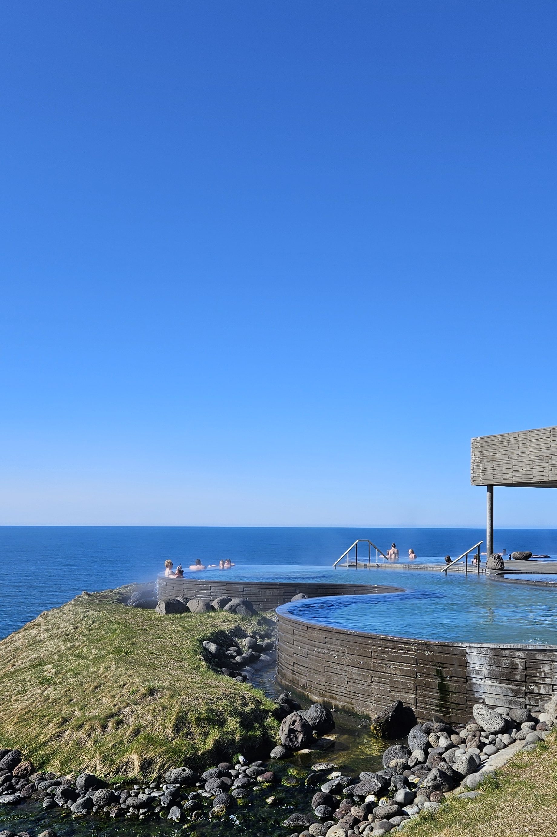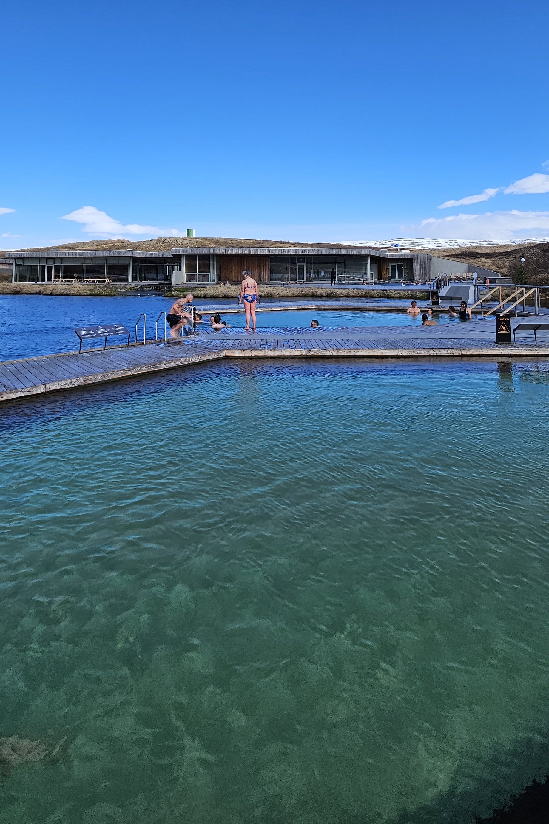 Le check-in de l’hôtel n’était pas encore disponible. Nous avons donc décidé d’aller au Secret Lagoon, la plus ancienne piscine d’Islande. L’aménagement est assez sommaire par rapport à certains bains thermaux que l’on peut trouver dans le pays. Il y a un grand bassin et la température varie d’un côté à l’autre. C’était tout de même très sympa pour une première découverte des bains chauds islandais.