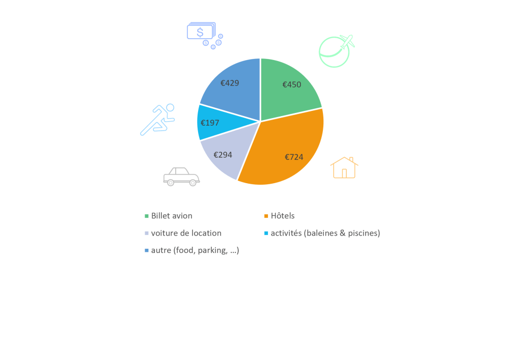 Nous avons dépensé environ 2090€/pers pour 11 jours et 11 nuits sur place. Nous avons voyagé à 2 ce qui permet de diviser les coûts de la voiture de location, de l’essence et des hôtels.