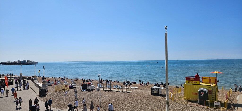 Une fois arrivés à Brighton, nous sommes directement allés à la plage. Elle est très étendue et, même si ce sont des galets, il y avait beaucoup de monde qui profitait au soleil directement sur le sol ou sur les transats disponibles.