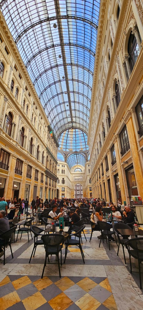On a ensuite continué à pied jusqu’à la galerie Umberto I qui ressemble, je trouve, beaucoup à la galerie Vittorio Emanuele à côté du Duomo à Milan. La galerie Umberto de Naples est une galerie marchande avec des restaurants, des cafés, des boutiques et un joli dôme au centre.